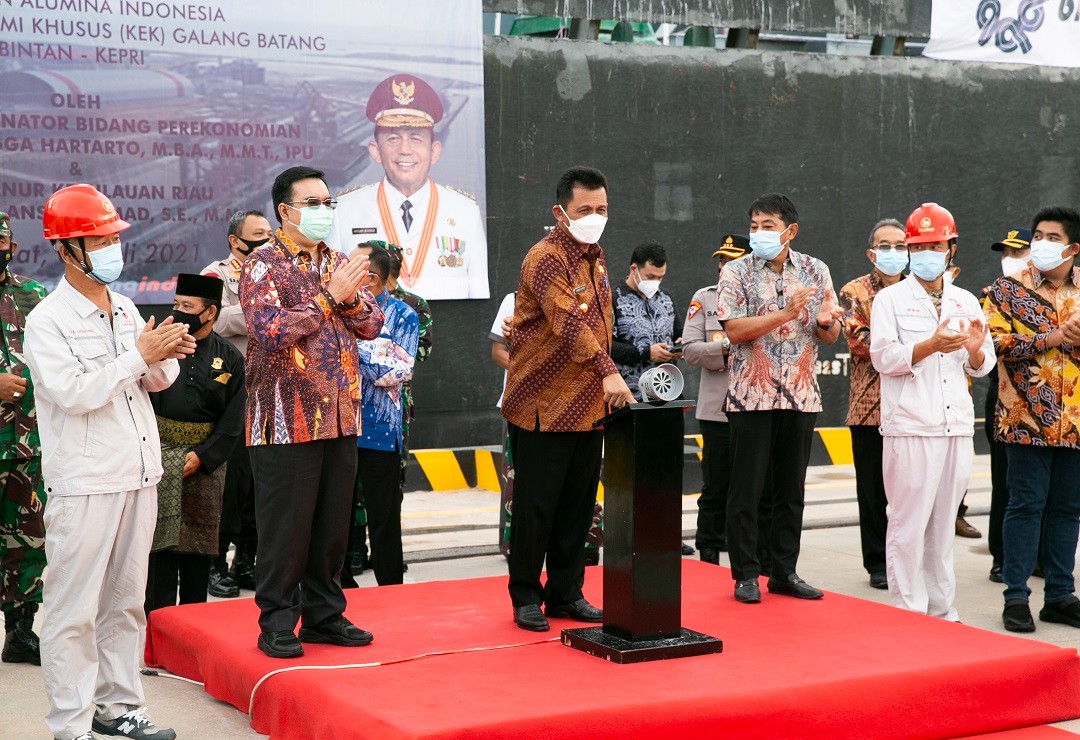 In the afternoon of 2 July 2021, the Indonesian Coordinating Minister for the Economy Airlangga Hartarto and the Minister of Industry Agus Gumiwang Kartasasmita via video connection, the Governor of the Riau Islands Ansar Ahmad came to the location and attended the opening ceremony for the alumina shipment from PT.BAI. Company leaders Santony, Jia Zhenjiang, Hao Weisong and others also welcomed.
