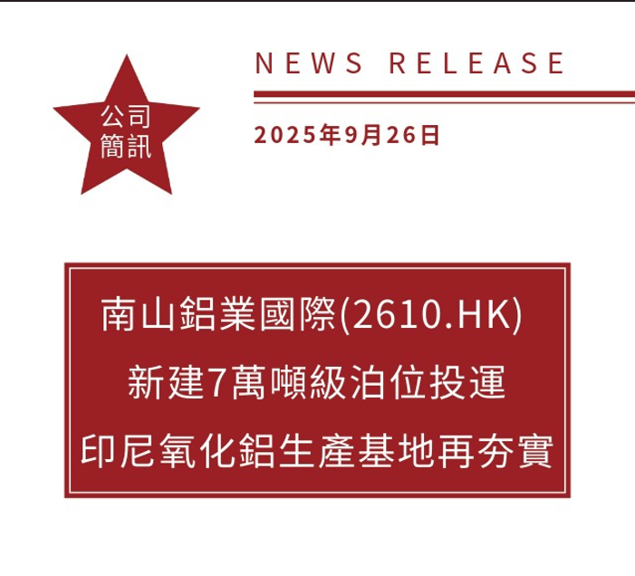 南山鋁業國際(2610.HK)新建7萬噸級泊位投運 印尼氧化鋁生產基地再夯實