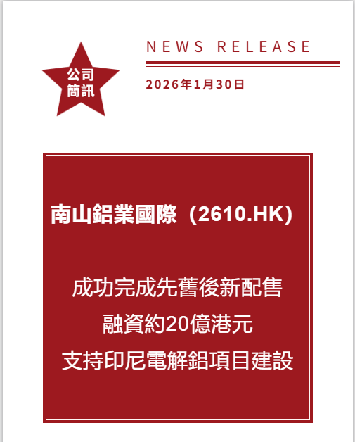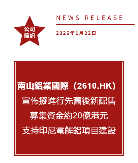 南山鋁業國際(2610.HK)宣佈擬進行先舊後新配售:募集資金約20億港元,支持印尼電解鋁項目建設